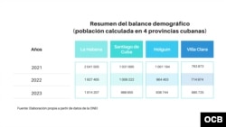 En la publicación “Indicadores Demográficos de Cuba y sus territorios 2023”, del Centro de Estudios de Población y Desarrollo (CEPDE), adscrito a la ONEI, una entidad estatal subordinada al Consejo de Ministros, se muestra en el resumen del balance demográfico que el país tenía una población calculada al cierre de 2020 de 11 millones 181 mil 595 habitantes, que fueron disminuyendo a 10 millones 885 mil 341 (2021); 10 millones 428 mil 733 (2022) y 10 millones 55 mil 968 (2023), esta última, una cifra similar a la de 1985.